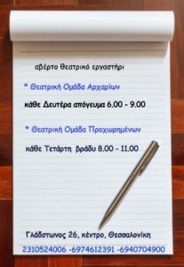 α) «Θεατρική Ομάδα αρχαρίων», κάθε Δευτέρα 6.00 μ.μ. -9.00 μ.μ.